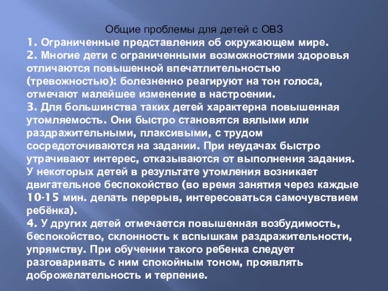 2. Многие дети с ограниченными возможностями здоровья отличаются повышенной впечатлительностью (тревожностью): болезненно реагируют на тон голоса, отмечают малейшее изменение в настроении.