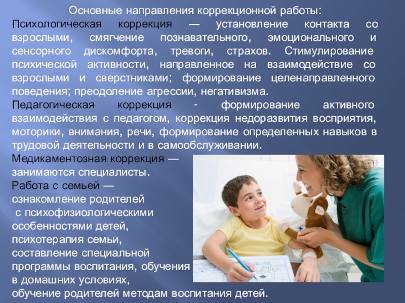 Педагогическая коррекция - формирование активного взаимодействия с педагогом, коррекция недоразвития восприятия, моторики, внимания, речи, формирование определенных навыков в трудовой деятельности и в самообслуживании.