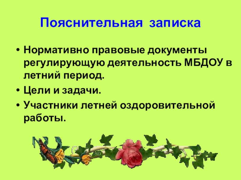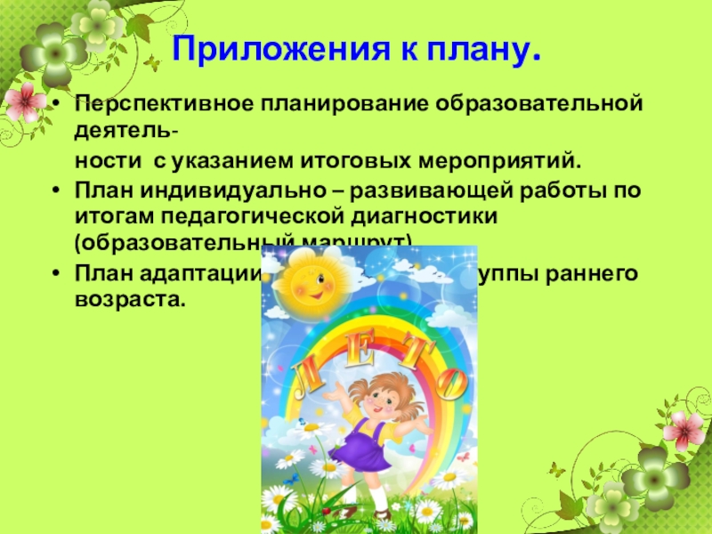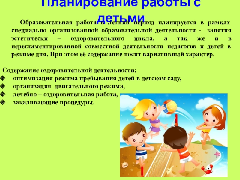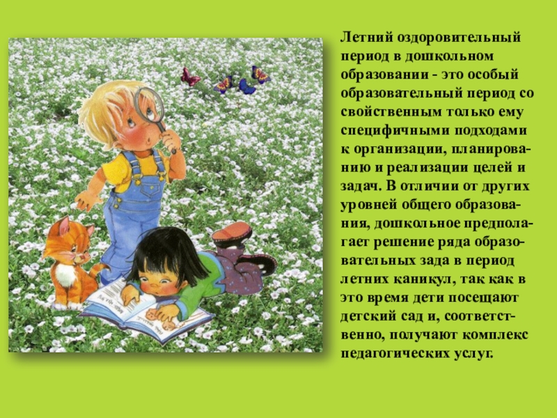 вательных зада в период летних каникул, так как в это время дети посещают детский сад и, соответст-