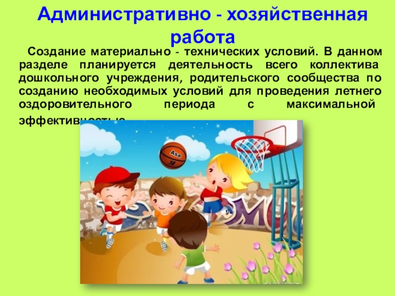 В данном разделе планируется деятельность всего коллектива дошкольного учреждения, родительского сообщества по созданию необходимых условий для проведения летнего оздоровительного периода с максимальной эффективностью.