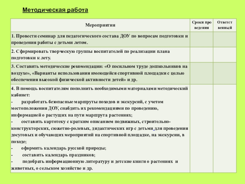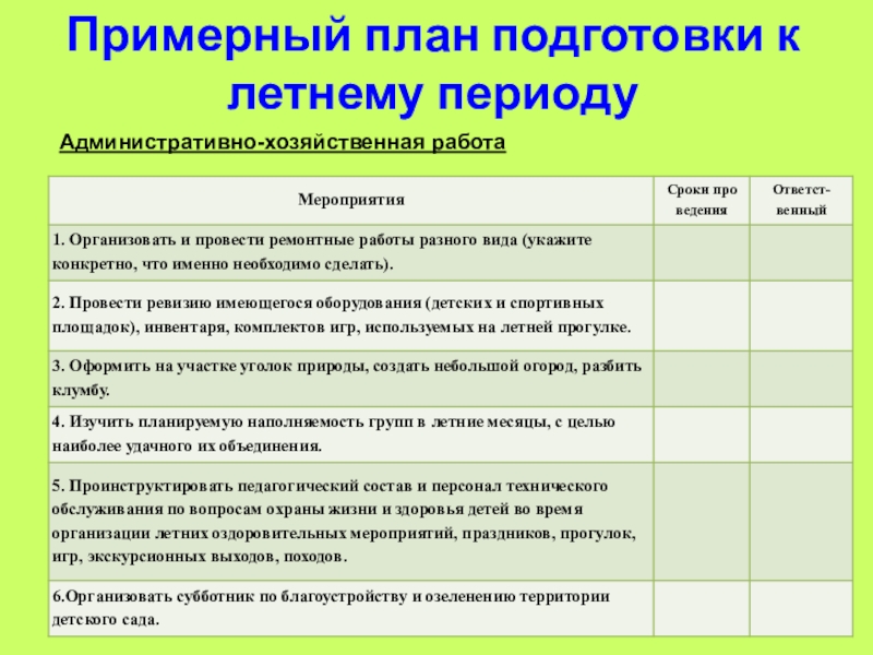 летних планов ДОУ, на которых медицинскому работнику поручить познакомить родителей с текущим состоянием здоровья детей, дать рекомендации; воспитателю – рассказать про план летней оздоровительной работы в детском саду.