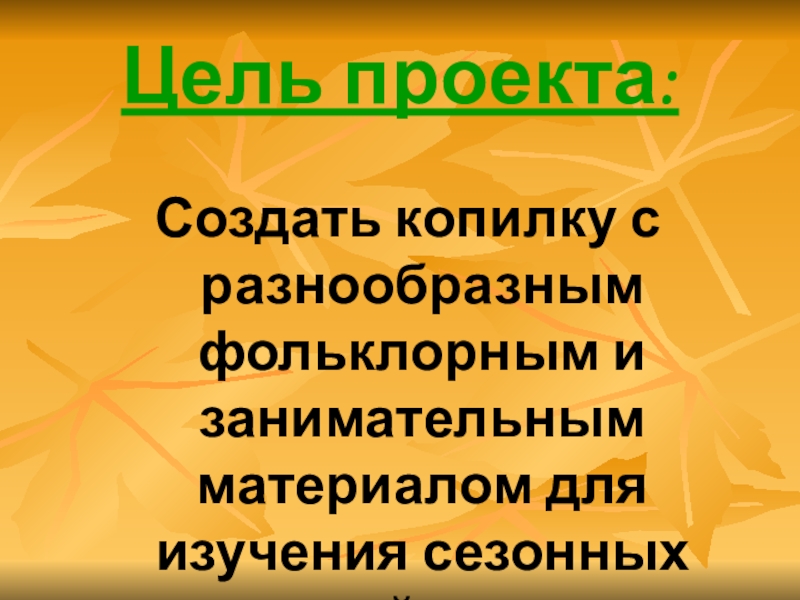 Цель проекта:Создать копилку с разнообразным фольклорным и занимательным материалом для изучения сезонных изменений в природе.