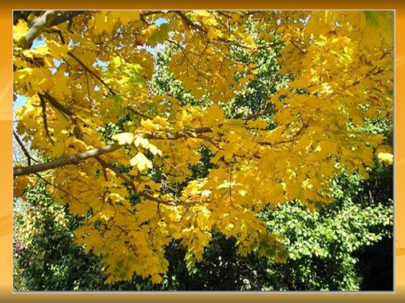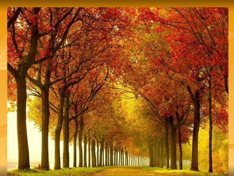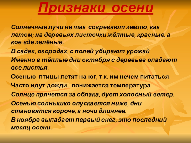 Признаки осени Солнечные лучи не так согревают землю, как летом; на деревьях листочки жёлтые, красные, а кое-где