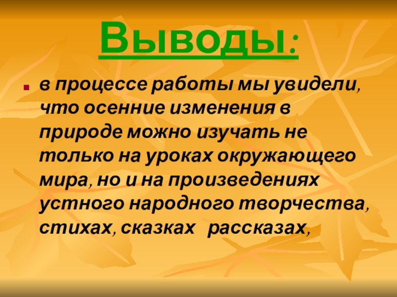 Выводы:в процессе работы мы увидели, что осенние изменения в природе можно изучать не только на уроках окружающего