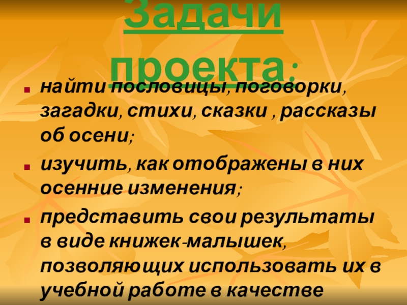 Задачи проекта:найти пословицы, поговорки, загадки, стихи, сказки , рассказы об осени;изучить, как отображены в них осенние изменения;представить