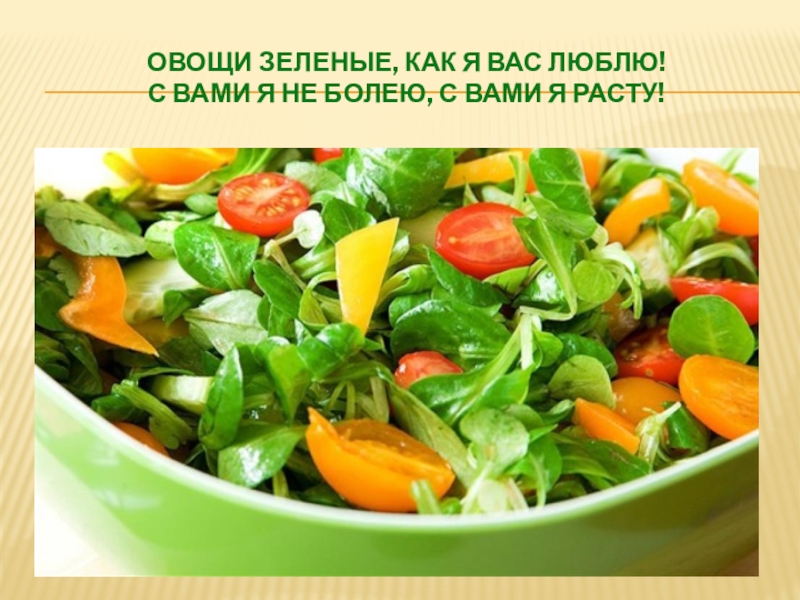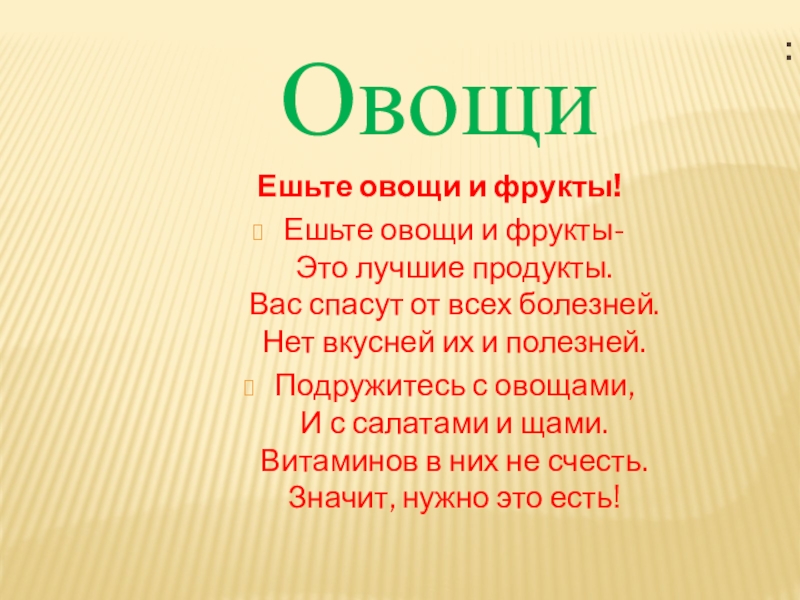 Подружитесь с овощами, И с салатами и щами. Витаминов в них не счесть. Значит, нужно это есть!