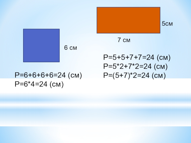 6 см5см7 смР=6+6+6+6=24 (см)Р=6*4=24 (см) Р=5+5+7+7=24 (см)Р=5*2+7*2=24 (см) Р=(5+7)*2=24 (см)