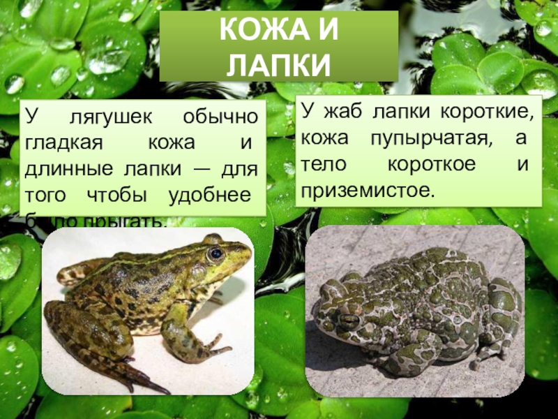 У жаб лапки короткие, кожа пупырчатая, а тело короткое и приземистое.