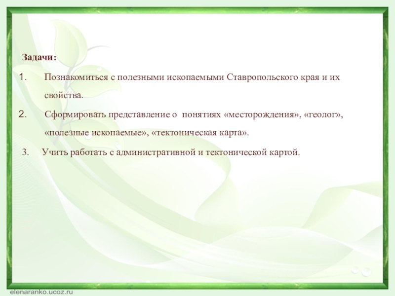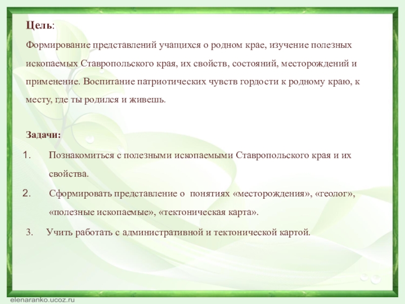 Сформировать представление о понятиях «месторождения», «геолог», «полезные ископаемые», «тектоническая карта».