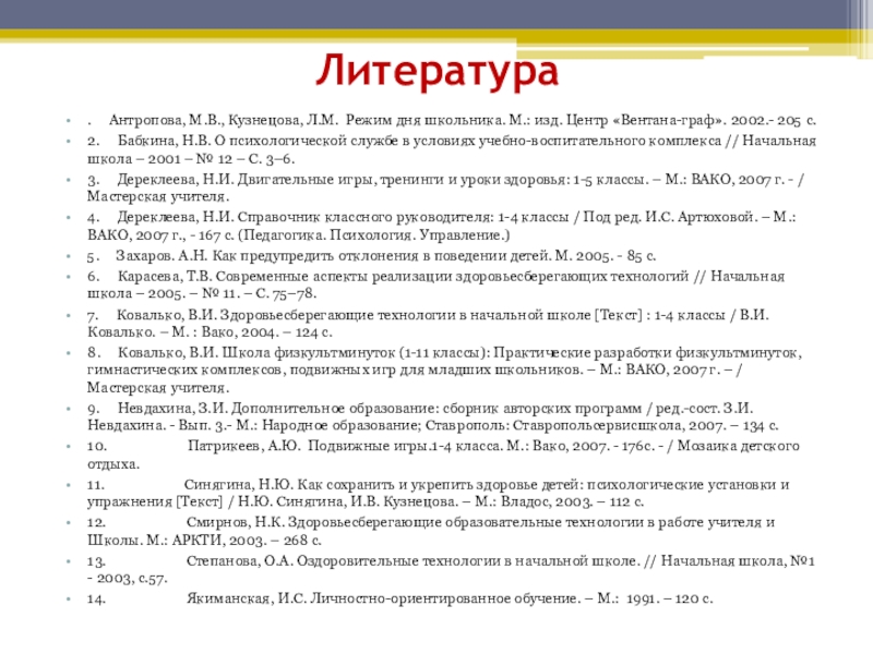 . Антропова, М.В., Кузнецова, Л.М. Режим дня школьника. М.: изд. Центр