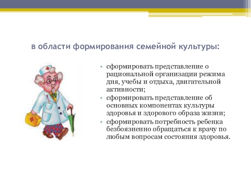 сформировать потребность ребенка безбоязненно обращаться к врачу по любым вопросам состояния здоровья.