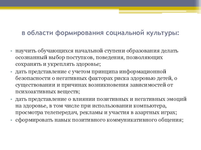 дать представление с учетом принципа информационной безопасности о негативных факторах риска здоровью детей, о существовании и причинах возникновения зависимостей от психоактивных веществ;