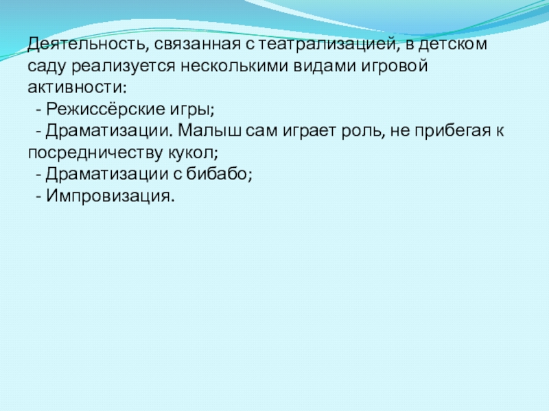 Слайд 11Деятельность, связанная с театрализацией, в детском саду реализуется несколькими видами игровой