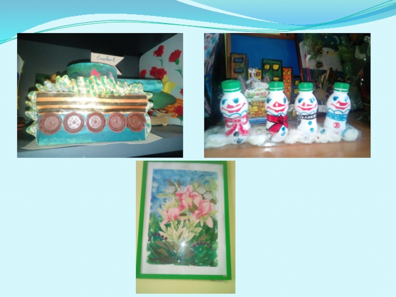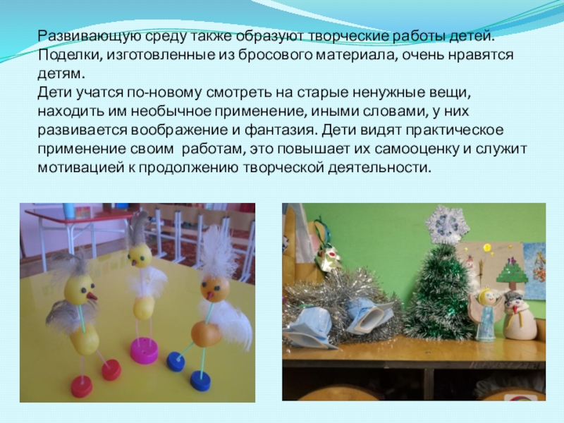 Слайд 7Развивающую среду также образуют творческие работы детей. Поделки, изготовленные из бросового