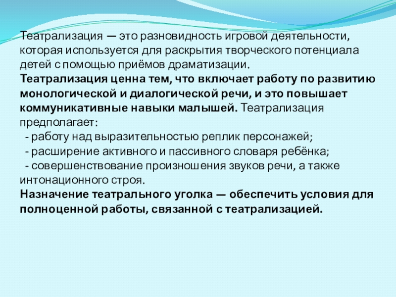 Слайд 10Театрализация — это разновидность игровой деятельности, которая используется для раскрытия творческого