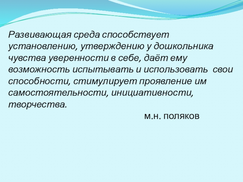 Слайд 2Развивающая среда способствует установлению, утверждению у дошкольника чувства уверенности в себе,
