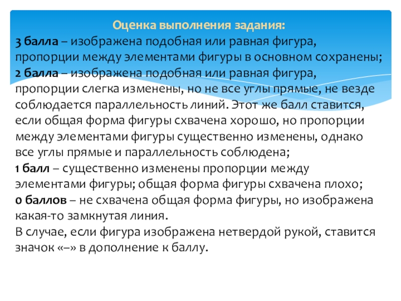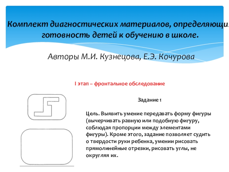 Цель. Выявить умение передавать форму фигуры (вычерчивать равную или подобную фигуру, соблюдая пропорции между элементами фигуры). Кроме этого, задание позволяет судить о твердости руки ребенка, умении рисовать прямолинейные отрезки, рисовать углы, не округляя их.