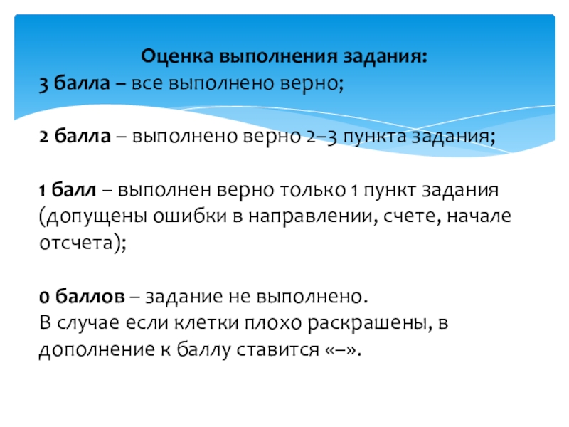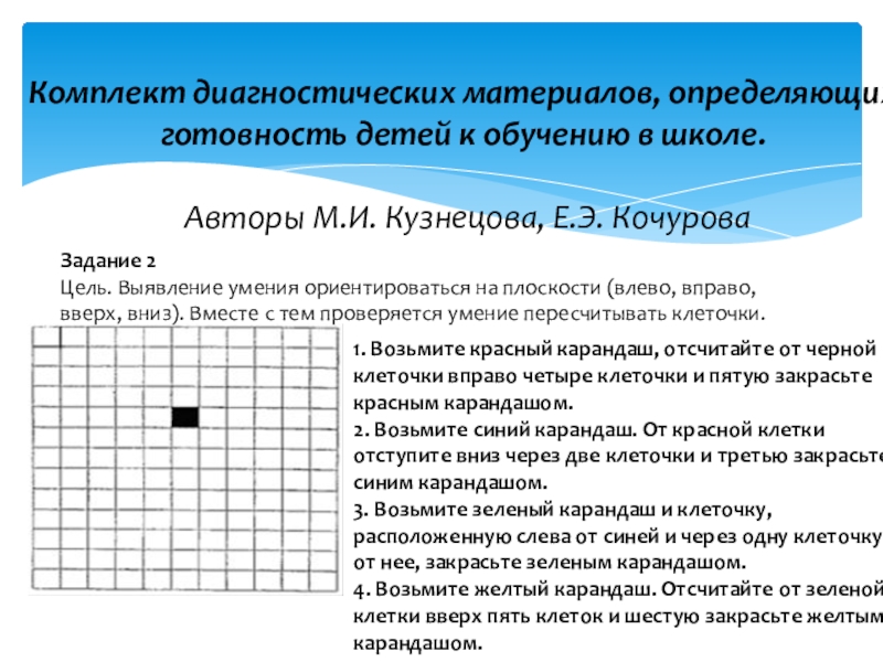 Цель. Выявление умения ориентироваться на плоскости (влево, вправо, вверх, вниз). Вместе с тем проверяется умение пересчитывать клеточки.