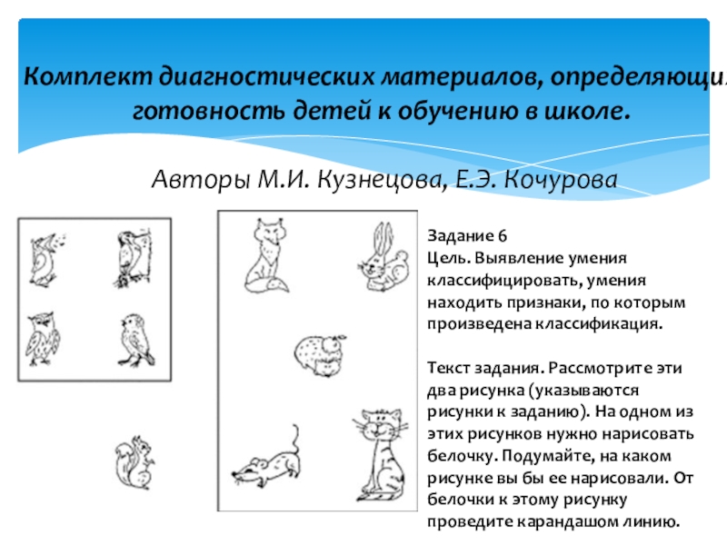 Цели. Выявление умения сравнивать множества по числу элементов; выявление способа сравнения двух множеств по числу элементов (вне зависимости от навыка счета).
