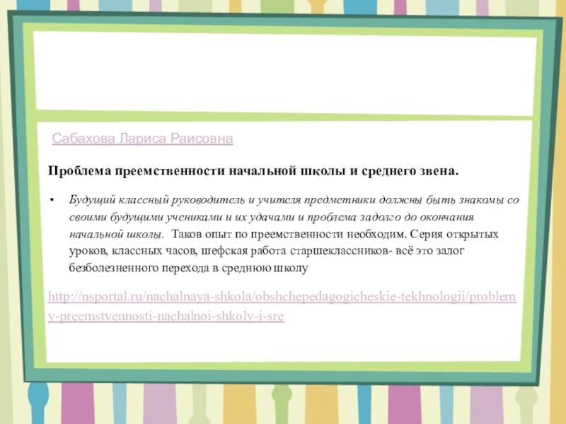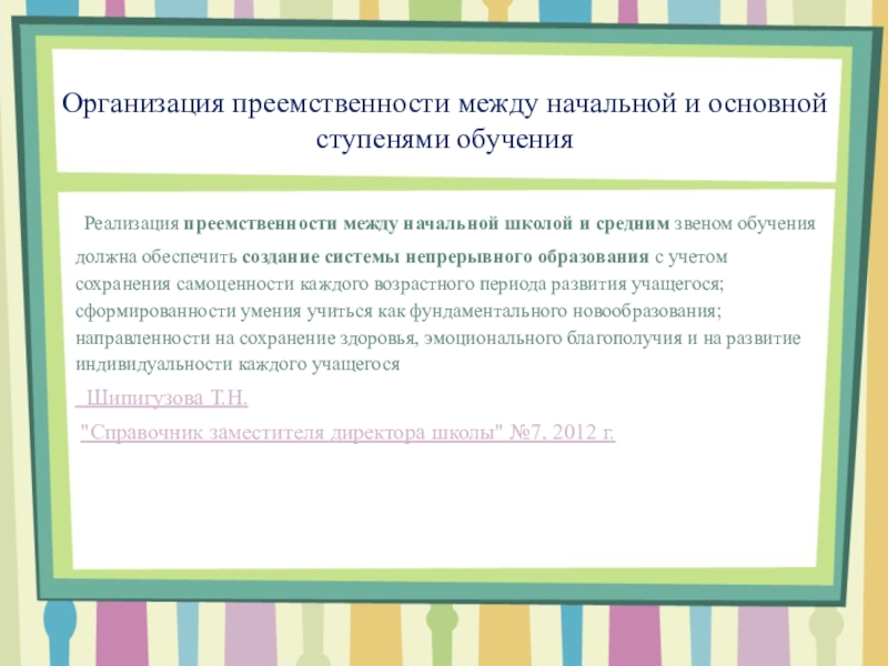 Понятие преемственности трактуется широко – как непрерывный процесс воспитания и обучения ребенка, имеющий общие и специфические цели для каждого возрастного периода, т.е. – это связь между различными ступенями развития, сущность которой состоит в сохранении тех или иных элементов целого или отдельных характеристик при переходе к новому состоянию.
