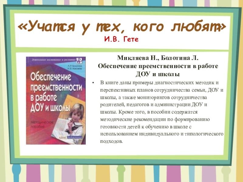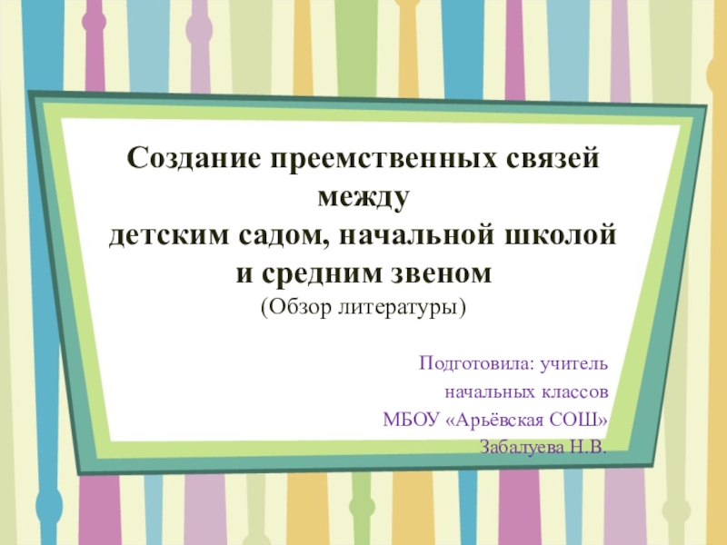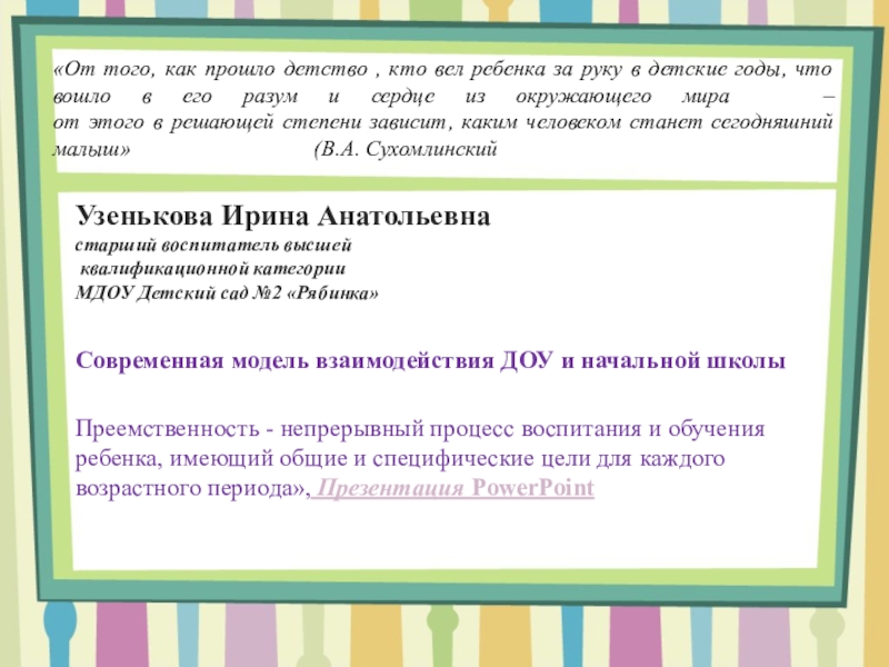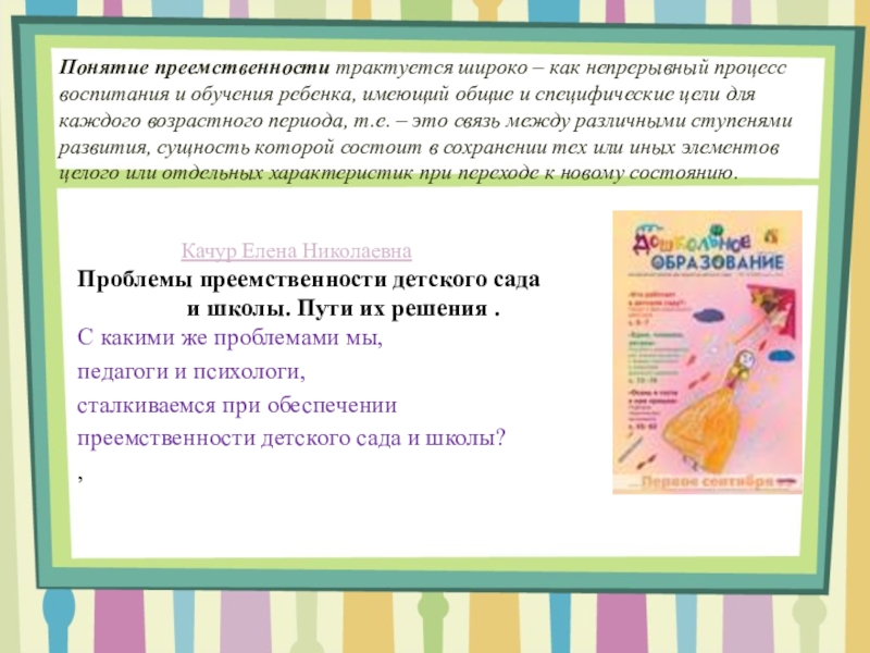Преемственность - непрерывный процесс воспитания и обучения ребенка, имеющий общие и специфические цели для каждого возрастного периода», Презентация PowerPoint