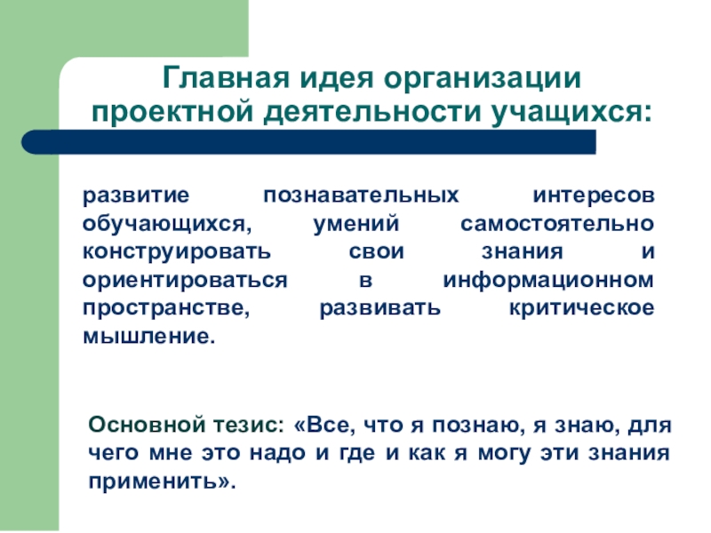 Основной тезис: «Все, что я познаю, я знаю, для чего мне это надо и где и как я могу эти знания применить».