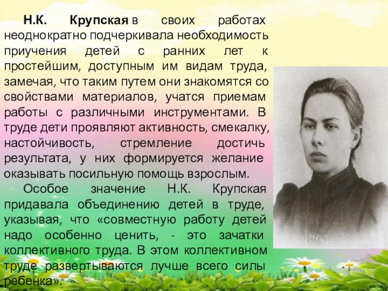 Слайд 8Н.К. Крупская в своих работах неоднократно подчеркивала необходимость приучения детей с ранних
