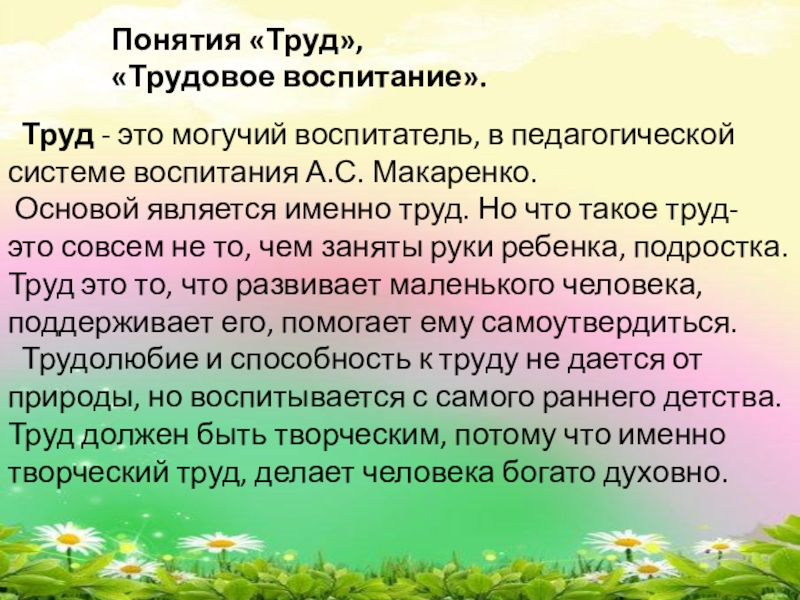 Основой является именно труд. Но что такое труд- это совсем не то, чем заняты руки ребенка, подростка. Труд это то, что развивает маленького человека, поддерживает его, помогает ему самоутвердиться.