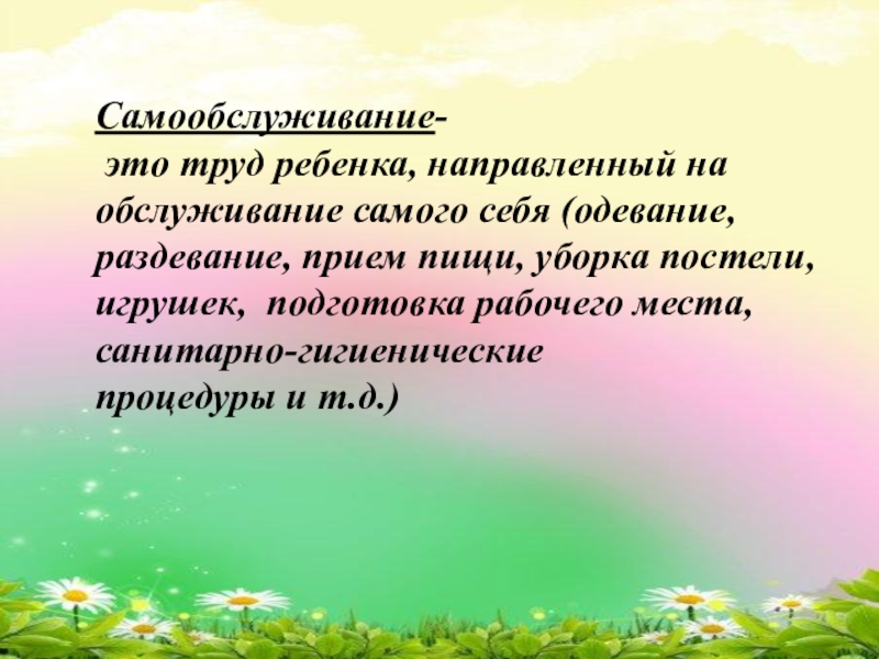 это труд ребенка, направленный на обслуживание самого себя (одевание, раздевание,