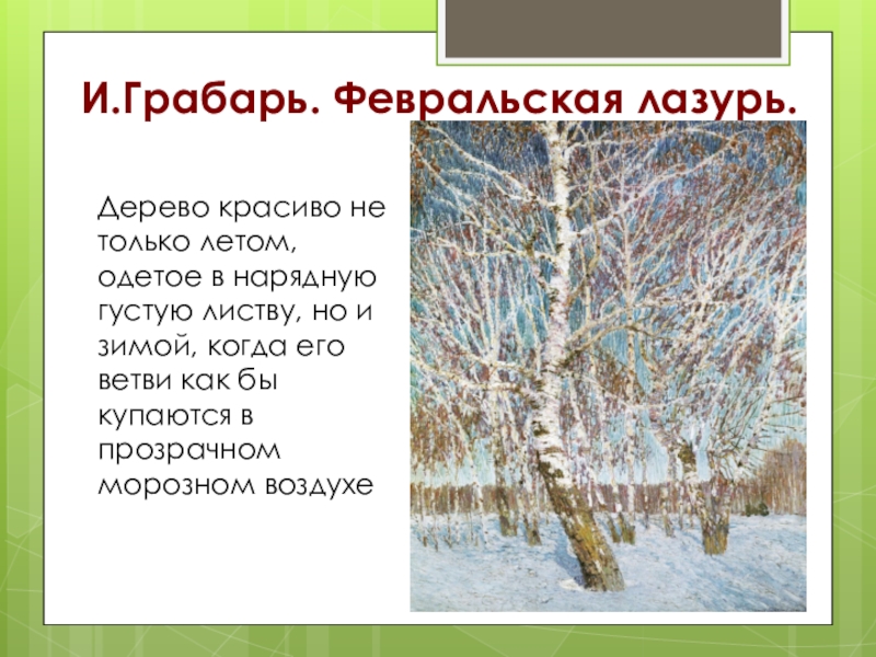 листву, но и зимой, когда его ветви как бы купаются в прозрачном морозном воздухе