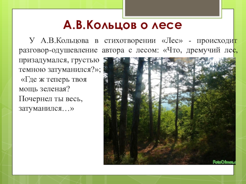 У А.В.Кольцова в стихотворении «Лес» - происходит разговор-одушевление автора