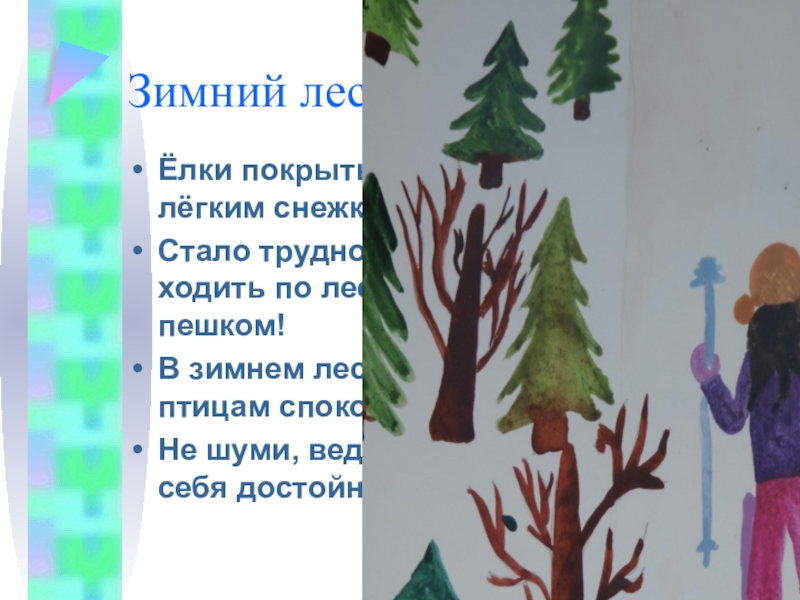 дает человеку все: радость, мудрость, красоту. В произведении «Лес осенью»; «Меж редеющих вершин показалась синева»; «Стала ель в лесу заметней – бережет густую тень»;