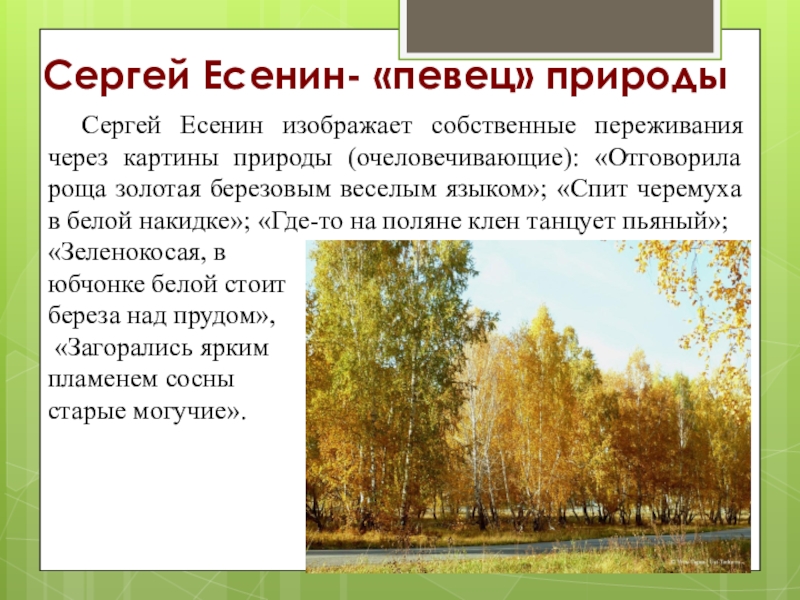 (очеловечивающие): «Отговорила роща золотая березовым веселым языком»; «Спит черемуха в белой накидке»; «Где-то на поляне клен танцует пьяный»;