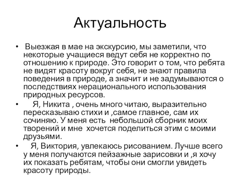 ведут себя не корректно по отношению к природе. Это говорит о том, что ребята не видят красоту вокруг себя, не знают правила поведения в природе, а значит и не задумываются о последствиях нерационального использования природных ресурсов.