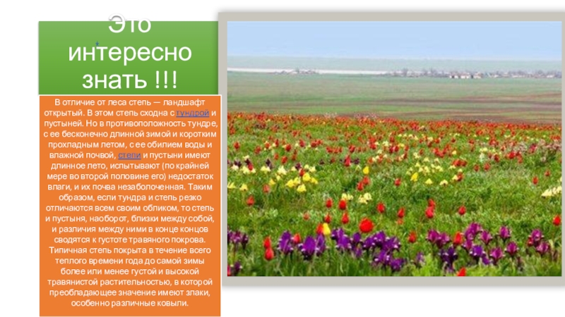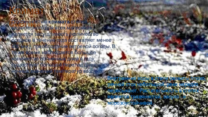 Внутренние воды в степи развиты плохо, речной сток небольшой, реки нередко пересыхают. Растительность в степях является травянистой, засухо - и морозоустойчивой.