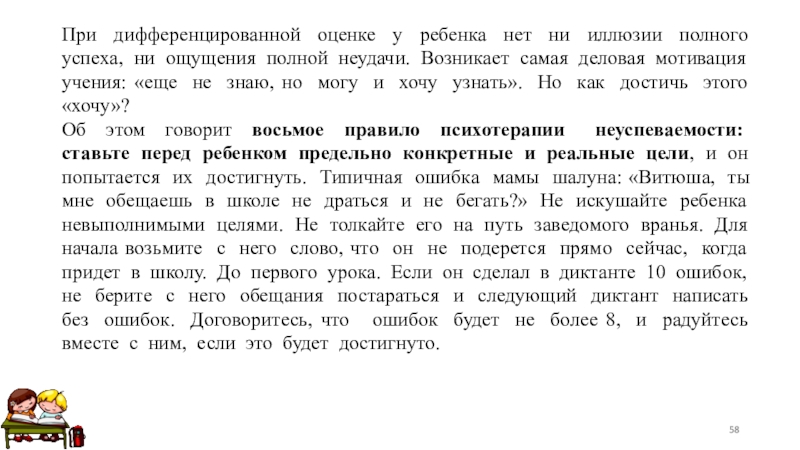 Слайд 58При дифференцированной оценке у ребенка нет ни иллюзии полного успеха, ни