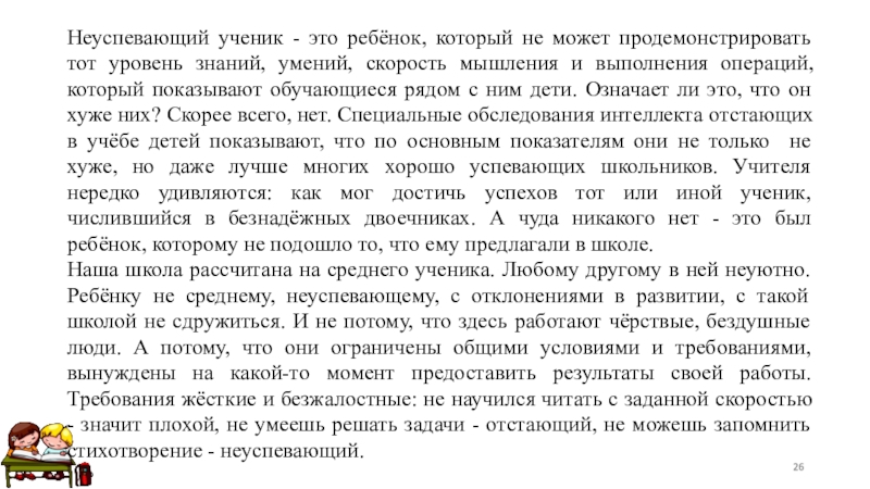 Слайд 26Неуспевающий ученик - это ребёнок, который не может продемонстрировать тот уровень