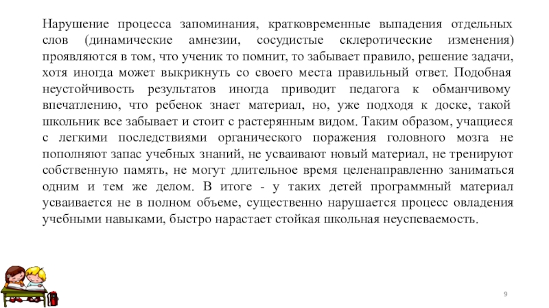 изменения) проявляются в том, что ученик то помнит, то забывает правило, решение задачи, хотя иногда может выкрикнуть со своего места правильный ответ. Подобная неустойчивость результатов иногда приводит педагога к обманчивому впечатлению, что ребенок знает материал, но, уже подходя к доске, такой школьник все забывает и стоит с растерянным видом. Таким образом, учащиеся с легкими последствиями органического поражения головного мозга не пополняют запас учебных знаний, не усваивают новый материал, не тренируют собственную память, не могут длительное время целенаправленно заниматься одним и тем же делом. В итоге - у таких детей программный материал усваивается не в полном объеме, существенно нарушается процесс овладения учебными навыками, быстро нарастает стойкая школьная неуспеваемость.