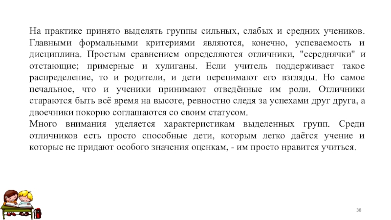Слайд 38На практике принято выделять группы сильных, слабых и средних учеников. Главными