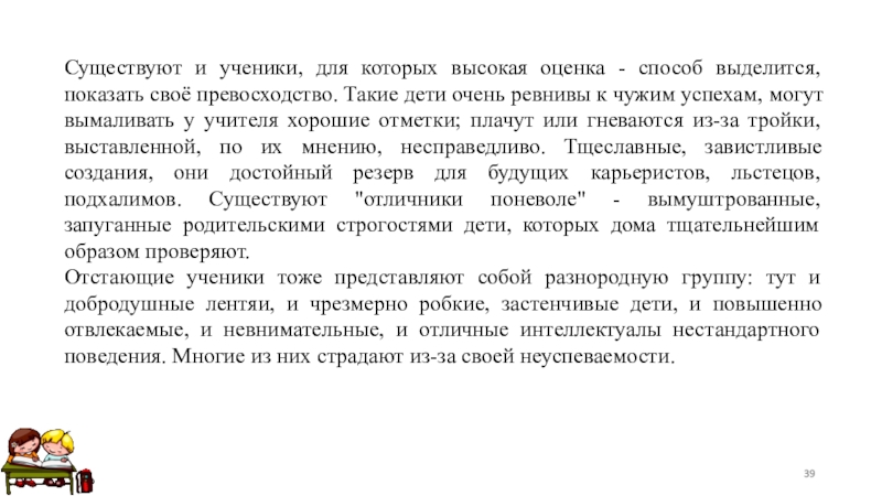 Слайд 39Существуют и ученики, для которых высокая оценка - способ выделится, показать