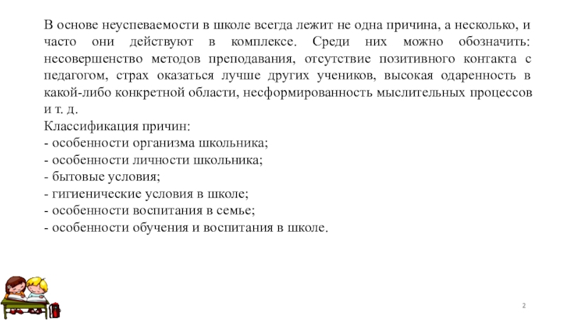 Слайд 2В основе неуспеваемости в школе всегда лежит не одна причина, а