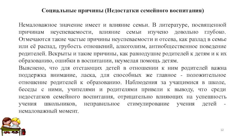 Слайд 12Социальные причины (Недостатки семейного воспитания)