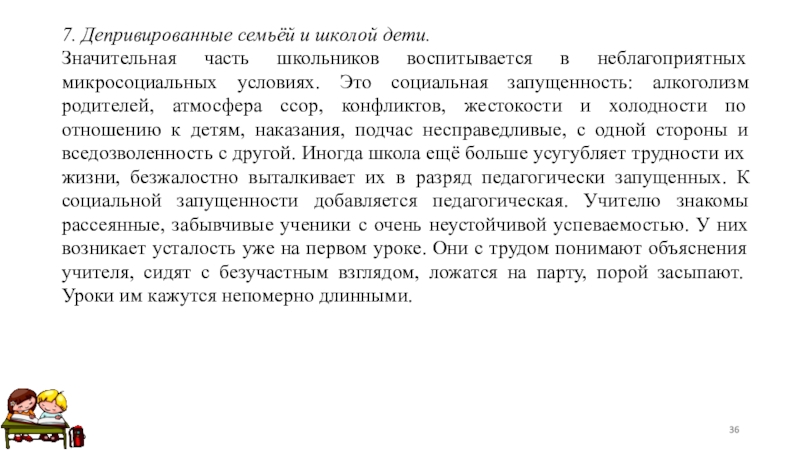микросоциальных условиях. Это социальная запущенность: алкоголизм родителей, атмосфера ссор, конфликтов, жестокости и холодности по отношению к детям, наказания, подчас несправедливые, с одной стороны и вседозволенность с другой. Иногда школа ещё больше усугубляет трудности их жизни, безжалостно выталкивает их в разряд педагогически запущенных. К социальной запущенности добавляется педагогическая. Учителю знакомы рассеянные, забывчивые ученики с очень неустойчивой успеваемостью. У них возникает усталость уже на первом уроке. Они с трудом понимают объяснения учителя, сидят с безучастным взглядом, ложатся на парту, порой засыпают. Уроки им кажутся непомерно длинными.