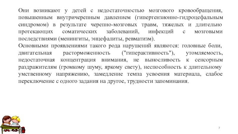 Слайд 7Они возникают у детей с недостаточностью мозгового кровообращения, повышенным внутричерепным давлением