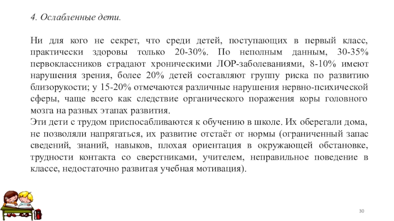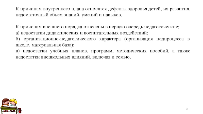 Слайд 3К причинам внутреннего плана относятся дефекты здоровья детей, их развития, недостаточный