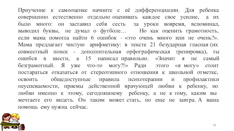 Слайд 61Приучение к самооценке начните с её дифференциации. Для ребенка совершенно естественно
