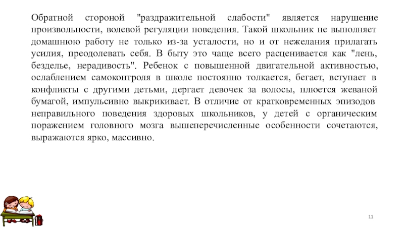 Слайд 11Обратной стороной "раздражительной слабости" является нарушение произвольности, волевой регуляции поведения. Такой