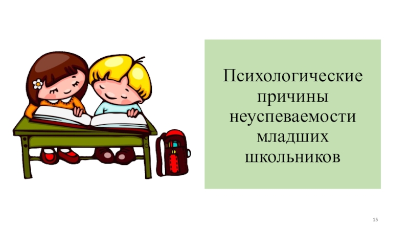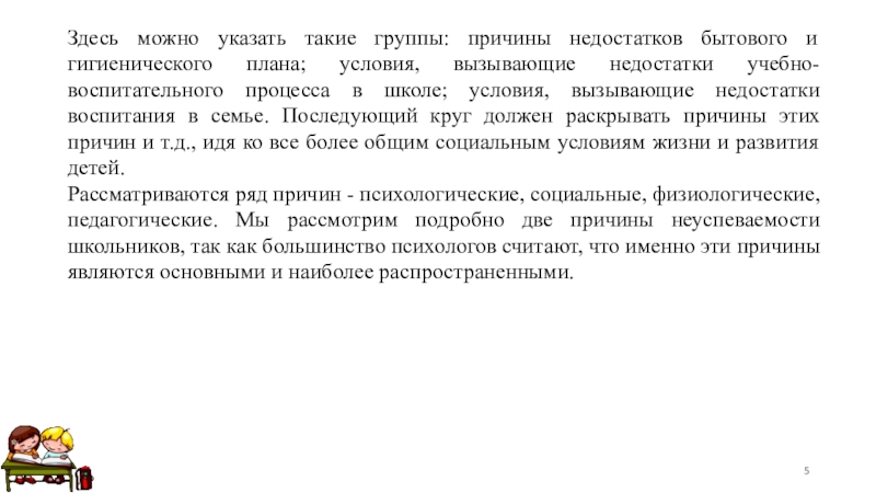 Рассматриваются ряд причин - психологические, социальные, физиологические, педагогические. Мы рассмотрим подробно две причины неуспеваемости школьников, так как большинство психологов считают, что именно эти причины являются основными и наиболее распространенными.