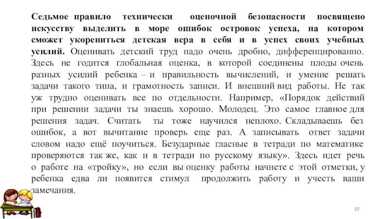 ошибок островок успеха, на котором сможет укорениться детская вера в себя и в успех своих учебных усилий. Оценивать детский труд надо очень дробно, дифференцированно. Здесь не годится глобальная оценка, в которой соединены плоды очень разных усилий ребенка – и правильность вычислений, и умение решать задачи такого типа, и грамотность записи. И внешний вид работы. Не так уж трудно оценивать все по отдельности. Например, «Порядок действий при решении задачи ты знаешь хорошо. Молодец. Это самое главное для решения задач. Считать ты тоже научился неплохо. Складываешь без ошибок, а вот вычитание проверь еще раз. А записывать ответ задачи словом надо ещё поучиться. Безударные гласные в тетради по математике проверяются так же, как и в тетради по русскому языку». Здесь идет речь о работе на «тройку», но если вы оценку работы начнете с этой отметки, у ребенка едва ли появится стимул продолжить работу и учесть ваши замечания.