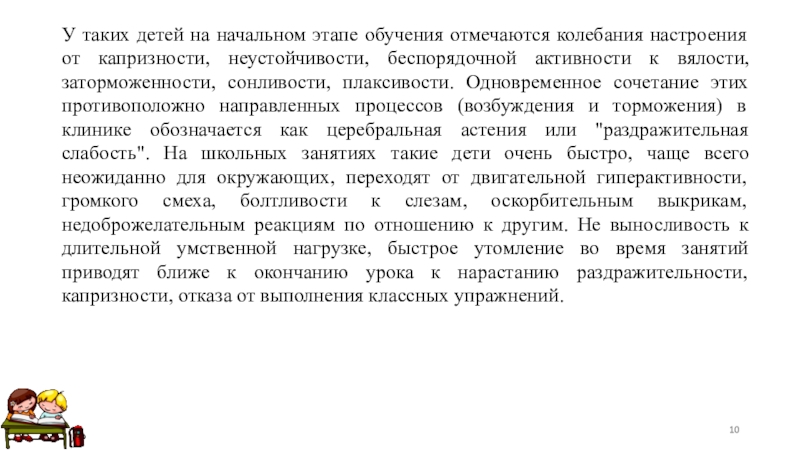 Слайд 10У таких детей на начальном этапе обучения отмечаются колебания настроения от